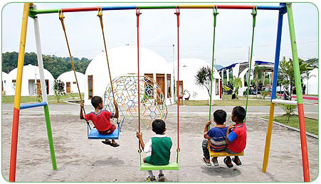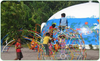 More than 370 people, comprised of both villagers and international experts, took active part in this project. The villagers were trained by DFTW, and quickly learned the unique construction methods used by DFTW to construct its Monolithic Ecoshell housing. The newly rebuilt village of Ngelepen is comprised of 71 homes; six communal domes offering laundry and bathroom facilities; a kindergarten school; a medical/health clinic and a mosque. To further enhance the community, additional effort was made in the building of a playground and the village's infrastructure of roads and a drainage system.