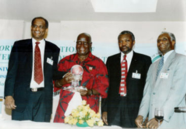 H.E. Dr. Kenneth David Kaunda, first President of the Republic of Zambia, was presented the WANGO Universal Peace Award 2004 at an Award Luncheon during the 3rd International Institute for Peace Through Tourism (IIPT) African Conference, being held at Hotel InterContinental Lusaka in Lusaka, Zambia, on February 5, 2005. H.E. Dr. Kaunda was bestowed the Universal Peace Award, WANGO’s highest award to individuals, because of his remarkable service to humanity, both in politics and in the non-governmental sector.